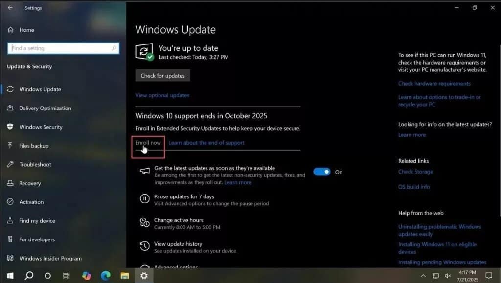 در زیر پیام مربوط به پایان پشتیبانی، بر روی لینک Enroll now کلیک کنید.
