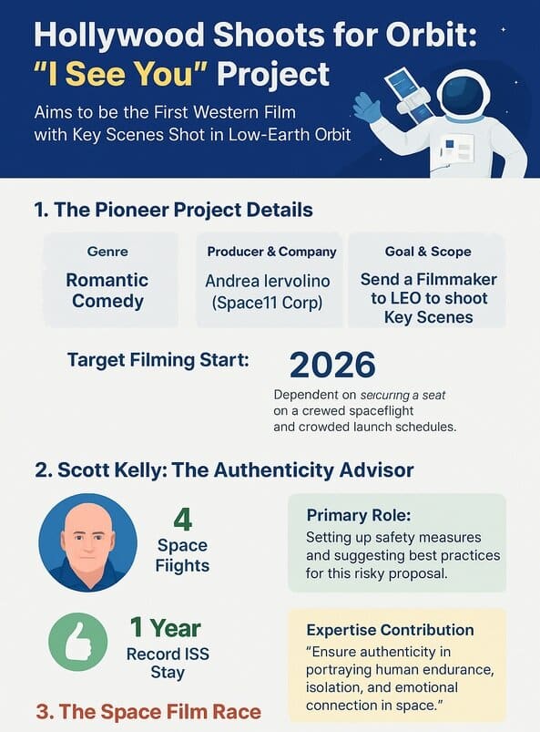 طبق گزارشهای منتشره به زودی شاهد پیوند جدیدی میان صنعت فضایی و هالیوود خواهیم بود؛ چرا که قرار است تا یک فیلمساز برای فیلمبرداری صحنههای کلیدی کمدی رمانتیک “تو را میبینم “به مدار پایین زمین پرتاب شود و این اولین فیلم غربی خواهد بود که در مدار زمین فیلمبرداری خواهد شد.